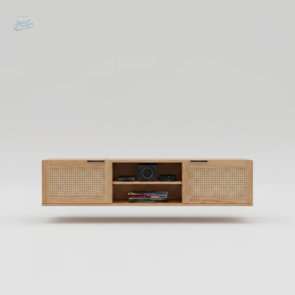 Vous apprécierez particulièrement la présence de deux portes latérales ornées de panneaux en cannage ajouré : ce détail élégant apporte une texture visuelle agréable et crée un contraste harmonieux avec le bois clair. Les poignées en métal noir, discrètes et modernes, renforcent l'aspect sophistiqué de cet engin suspendu. Vous profiterez ainsi d'un meuble qui combine praticité et élégance, parfait pour transformer votre salon en un lieu de détente raffiné.