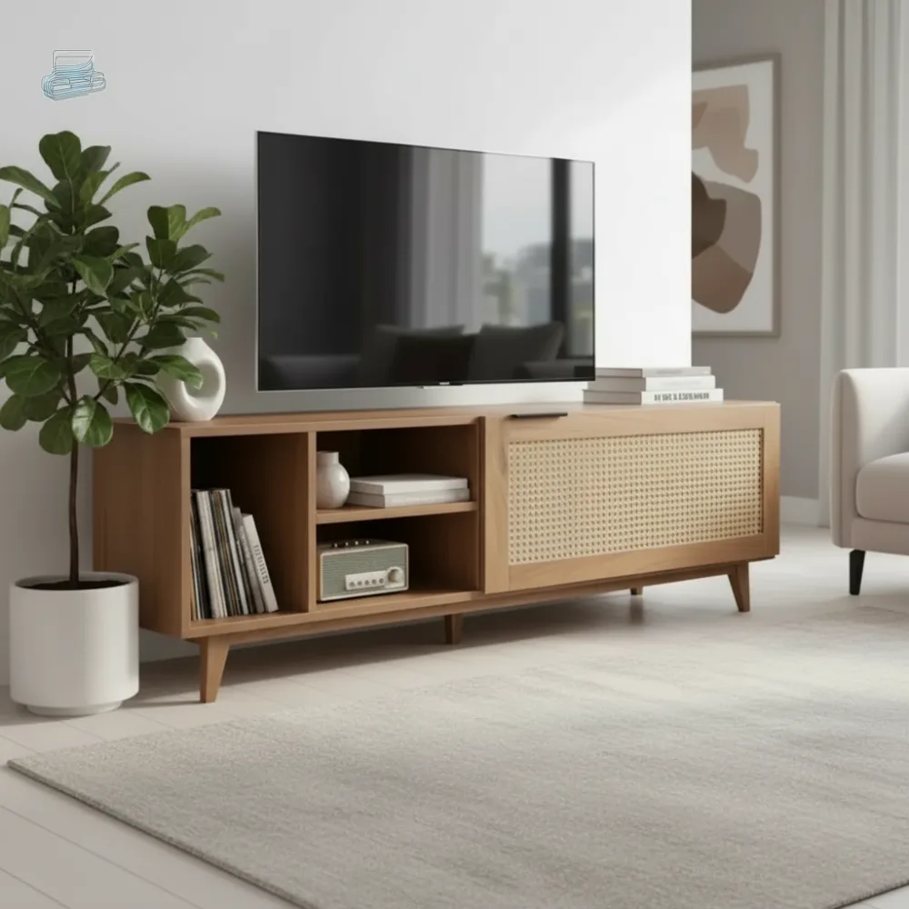 Si vous êtes sensible aux tendances décoratives actuelles, vous apprécierez cette association harmonieuse entre bois clair et rotin naturel. Ce mariage de matières crée une ambiance chaleureuse et raffinée, parfaite pour un salon moderne qui recherche authenticité et caractère. Quand vous inviterez vos amis pour une soirée cinéma, ce détail décoratif ne manquera pas d'attirer les regards admiratifs.